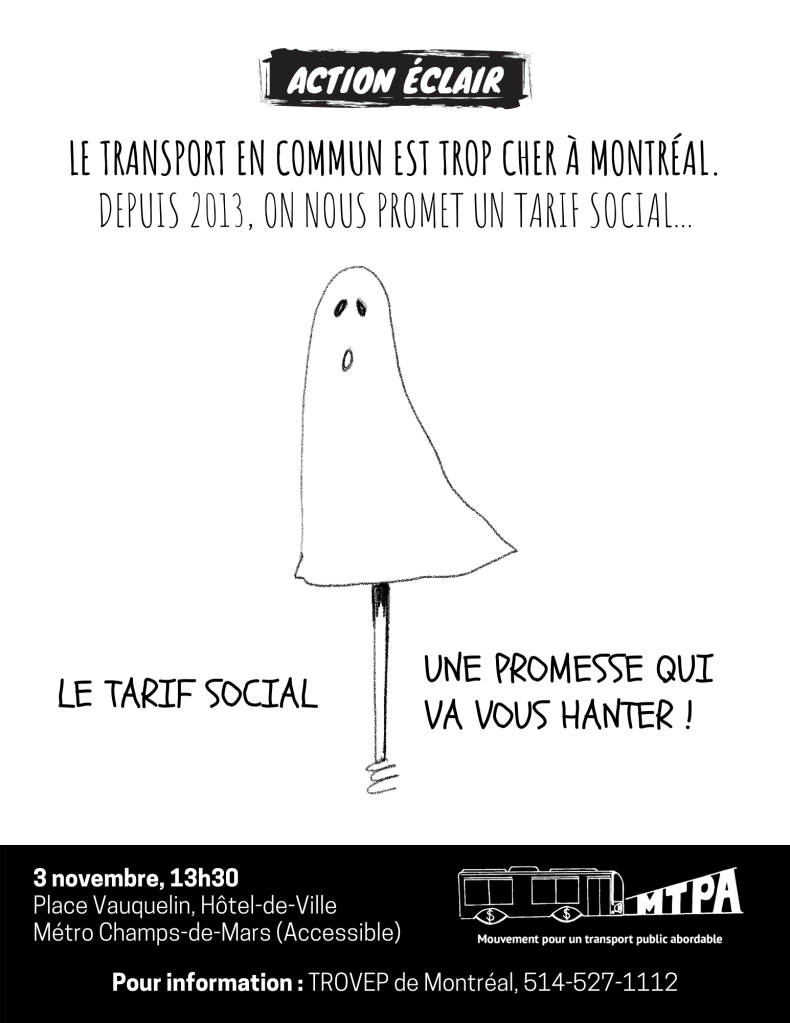 Le Mouvement pour un transport public abordable vous invite à l’action éclair Le tarif social, une promesse qui va vous hanter!